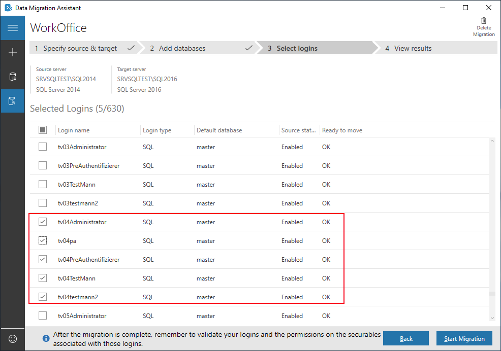 - Markieren Sie alle der WorkOffice-Datenbank zugehörigen SQL Benutzer und klicken Sie auf [Start Migration] um den Migrationsvorgang zu beginnen.