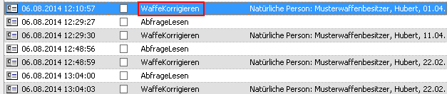 Der Zeitpunkt (Übermittelt am), die „Art der NWR Nachricht" (WaffeKorrigieren) sowie die Spalte „Person" bilden den gesamten Vorgang ab.