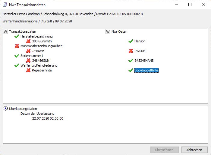 Die von Ihnen selektierten Daten werden in den Waffendatensatz im NWR gespeichert sobald Sie auf die Schaltfläche [Übernehmen] klicken.