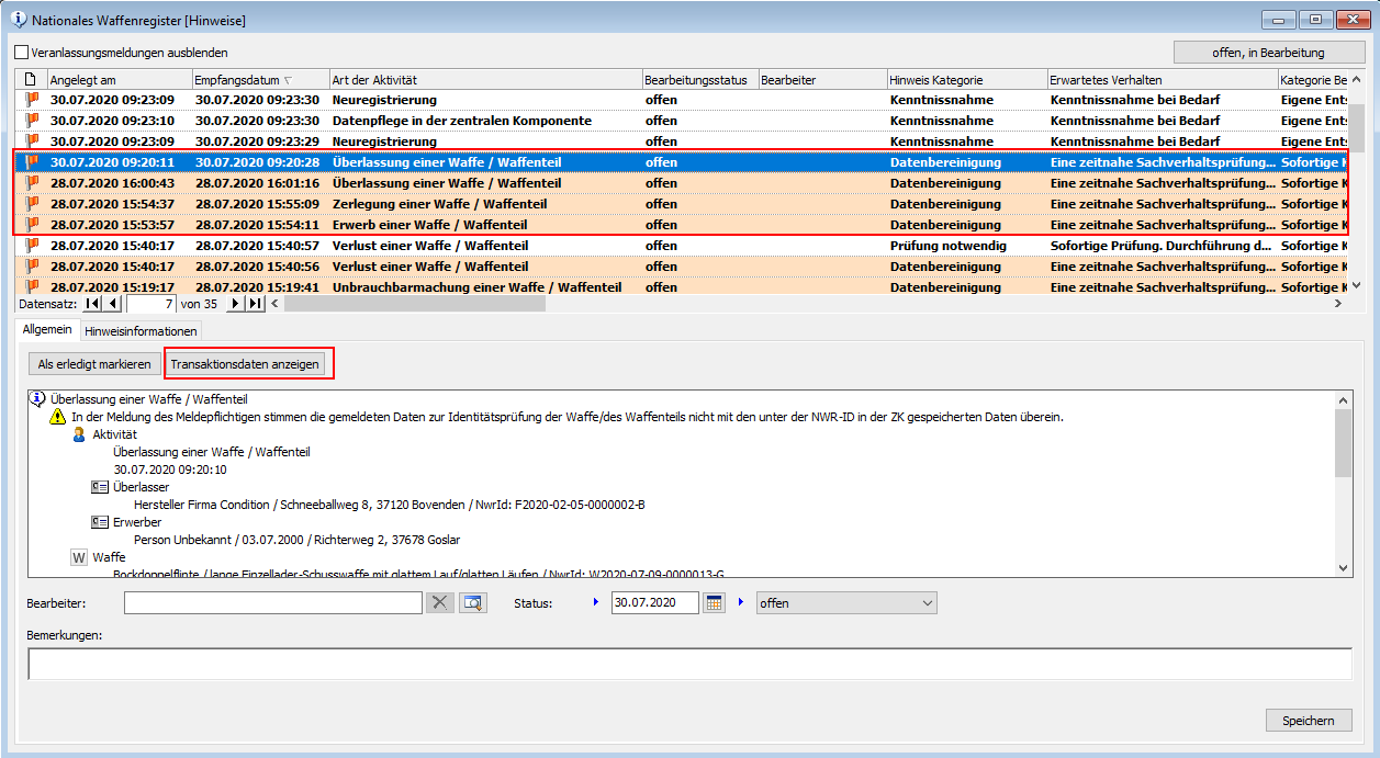 Es ist wichtig, dass Sie mit dem meldenden Hersteller oder Händler schriftlich oder telefonisch in Kontakt treten. Die abweichenden Dateneingaben müssen überprüft, gemeinsam besprochen und abschließend durch ihre Waffenbehörde freigegeben werden!