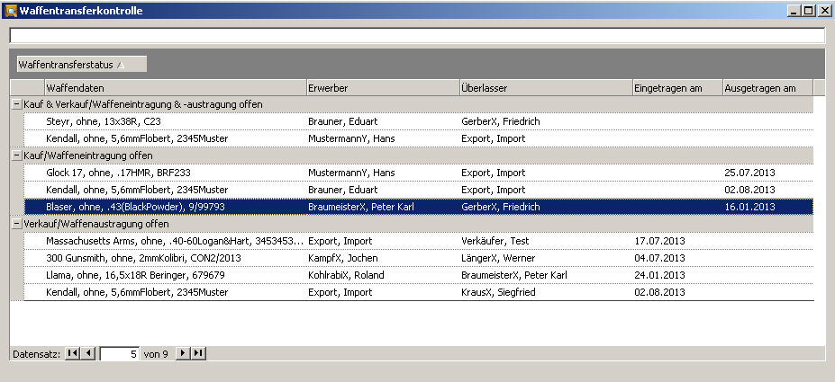 Im oberen Bereich der Waffentransferkontrolle können Sie die Ergebnisliste durch Eingabe eines Filterkriteriums einschränken, z. B. nach der Seriennummer der Waffe oder dem Nachnamen des Verkäufers. Durch einen Doppelklick mit der linken Maustaste auf den gewünschten Tabelleneintrag öffnet sich die "Waffentransfer"-Maske, über welche Sie den Eintrag überprüfen können.