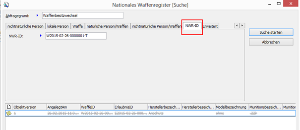 Der Abfragegrund ist ein Pflichtfeld. Um Ihre Suche starten zu können, müssen Sie in diesem Feld einen Text hinterlegen. Verwenden sie dabei bitte Begrifflichkeiten wie "Person Zuständigkeitswechsel", "Waffeneintragung" oder "Entzug einer waffenrechtliche Erlaubnis". Die Abfragegründe werden in der Datenbank des NWR gespeichert und dienen dabei, die Anfragen zu klassifizieren und evtl. datenschutzrechtliche Verletzungen aufzudecken.