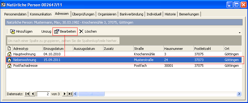 Um einen Adressdatensatz einer Person zu bearbeiten, öffnen Sie zuerst den gewünschten Personendatensatz und wechseln hier auf die Karteikarte "Adressen". Markieren Sie den zu bearbeitenden Datensatz in der im unteren Bereich der Maske befindlichen Tabelle und klicken Sie anschließend auf die Schaltfläche [Bearbeiten].