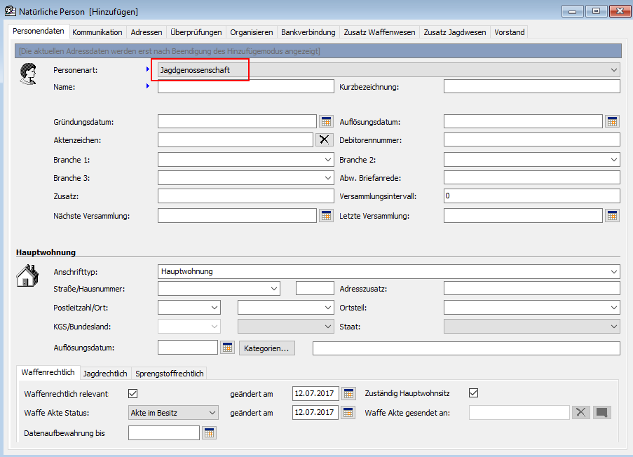 Die Basis für die Jagdverwaltung ist die Erfassung einer Jagdgenossenschaft mit deren Vorstehern oder Vorsitzenden. Bei diesem Personentyp stellt WorkOffice eine abweichende Eingabemaske zur Verfügung, bei der u.a. diverse Pflichtfelder der "juristischen Person" entfallen. Des Weiteren können z. B. zusätzliche Angaben unter dem neuen letzten Karteireiter "Vorstand" getätigt werden. Dieser Reiter kann nach dem Speichern der Jagdgenossenschaft mit Daten befüllt werden.