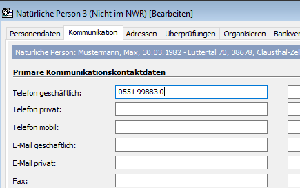 Damit Sie Daten in den "primären Kommunkationskontakt-Feldern" editieren können, muss sich der Personendatensatz im Bearbeitungsmodus befinden. Wenn Sie eine Korrektur ihrer Dateneingabe vornehmen möchten, klicken Sie mit der rechten Maustaste in die Bildschirmmaske und wählen die Option „Datensatz bearbeiten“. Alternativ können Sie den Bearbeitungsmodus über die obere Menüleiste „Bearbeiten -> Datensatz bearbeiten“ aktivieren.