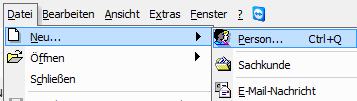 Alternativ können Sie auch die Tastenkombination [STRG] + [Q] nutzen, oder, wenn die Personenmaske bereits geöffnet ist, mit Hilfe der rechten Maustaste den Kontextmenüpunkt "Neu -> Person" auswählen. Es gibt also ein Vielzahl von Möglichkeiten, einen neuen Datensatz hinzuzufügen.