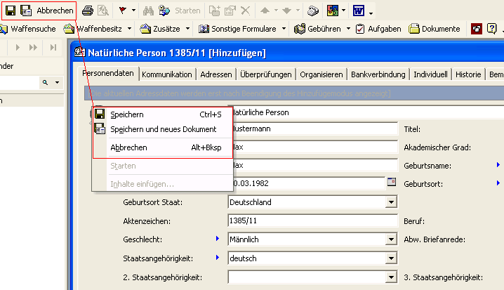 Nachdem Sie alle gewünschten Daten in die Eingabemaske eingetragen haben, speichern Sie die Daten, indem Sie mit der rechten Maustaste in die Bildschirmmaske klicken und den Menüpunkt „Speichern“ auswählen. Wenn Sie die Aktion verwerfen möchten, klicken Sie auf die Option [Abbrechen]. Die Optionen [Speichern] und [Abbrechen] stehen ihnen auch hier wiederum als alternative Schaltfläche in der oberen Menüleiste zur Verfügung.