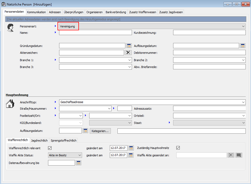 Die "Vereinigung" wird verwendet, wenn im Datenbestand ein Zusammenschluss mindestens zweier natürlicher und/oder juristischer Personen, die einen gemeinsamen Zweck verfolgen, hinterlegt werden soll (Erteilung einer Waffenbesitzkarte (§10 Abs. 2 für eine jagdrechtlichen Vereinigung)). Bei diesem Personentyp stellt WorkOffice eine abweichende Eingabemaske zur Verfügung, bei der u. a. diverse Pflichtfelder der "natürlichen Person" entfallen. Des Weiteren können z. B. die Branche und das Gründungsdatum einer Vereinigung hinterlegt werden. Wenn die Vereinigung im NWR gespeichert werden soll, sind die Branche und die Kurzbezeichnung als Pflichtfelder zu befüllen.