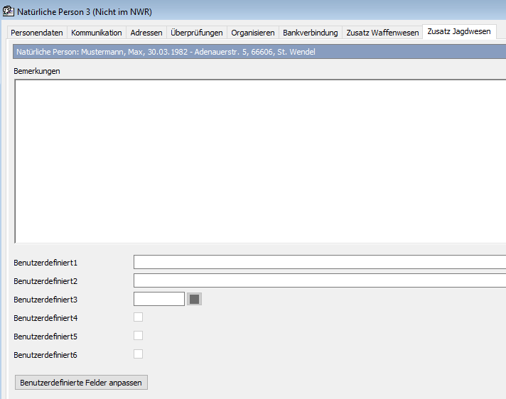 Auf der Karteikarte "Zusatz Jagdwesen" stehen Ihnen Datenfelder zur Verfügung, in denen Sie Bemerkungen oder benutzerdefinierte Informationen hinterlegen können. Hier hinterlegte Informationen können auch aus der Jagdverwaltung heraus bearbeiten werden, wenn die Person eine NWR ID erhalten hat.