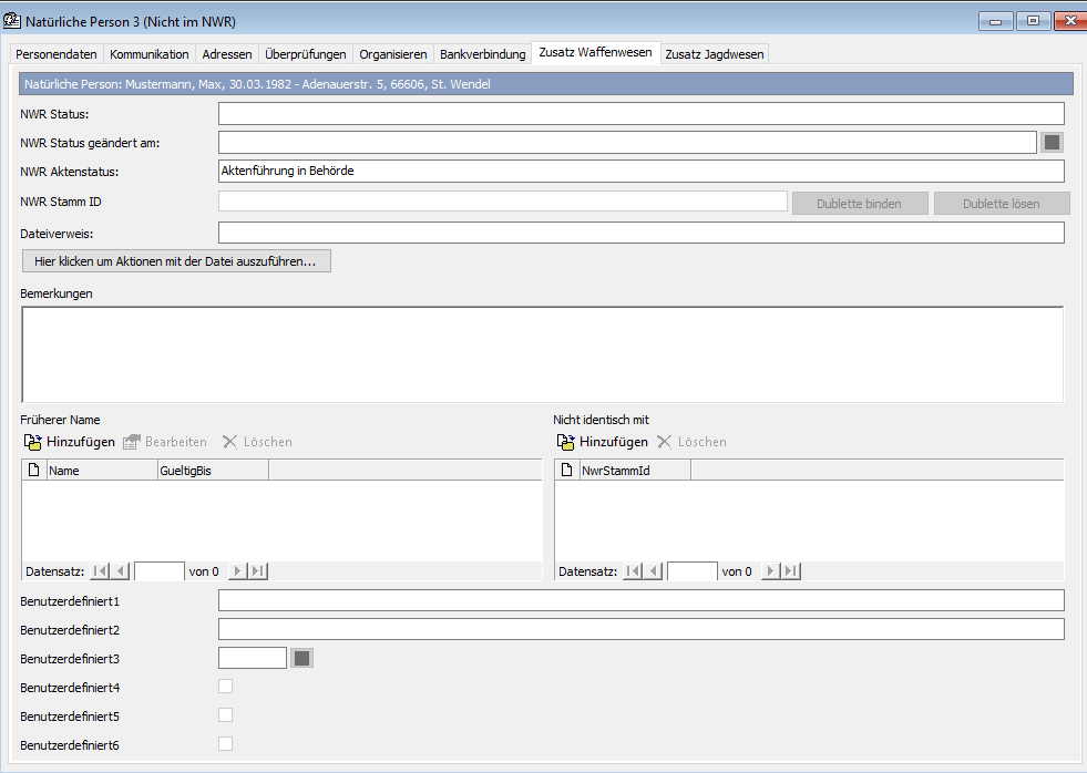Enthält die NWR Stamm ID, mit der eine Person im Nationalen Waffenregister geführt wird. Dies kann bei mehreren Personen gleich sein, wenn es sich um einen Dublettendatensatz handelt. Weitere Informationen erhalten Sie im Abschnitt "Dublette binden" und "Dublette lösen".