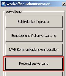Im nachfolgenden Fenster können Sie die Protokollauswertung aufrufen, indem Sie mit der linken Maustaste auf den gleichnamigen Eintrag im Tool „WorkOffice Administration" klicken.