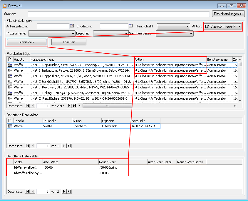 Erweitern Sie die Protokollmaske über die Schaltfläche [Filtereinstellungen] und schränken Sie Ihre Suche auf z.B. einen Personennamen, eine Erlaubnisnummer oder eine Waffenseriennummer ein.