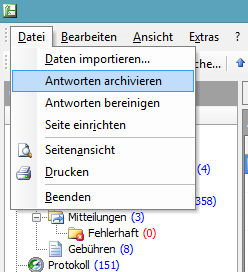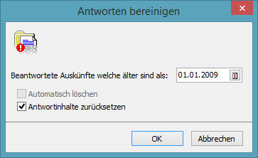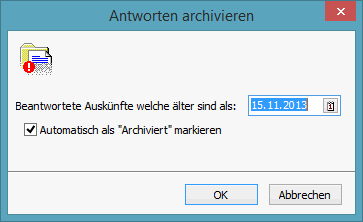 Über das Menü "Datei -> Antworten Archivieren" verschieben Sie alle "Beantworteten Auskünfte" mit einem "Antwortdatum" älter als das von Ihnen in der Maske hinterlegte Datum in den Ordner "Archivierte Auskünfte". Bei diesem Vorgang werden keine Bestandsdaten aus Ihrer  Datenbank gelöscht und können jederzeit aus den archivierten Auskünften wiederhergestellt werden.