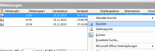 Um einen schriftlichen Ausdruck der Mitteilungsnachricht für Ihre Akten zu erzeugen, können Sie einen Tabelleneintrag im Bereich "Mitteilungen" markieren, diesen mit der rechten Maustaste anklicken und dann aus dem Untermenü "Drucken" auswählen.