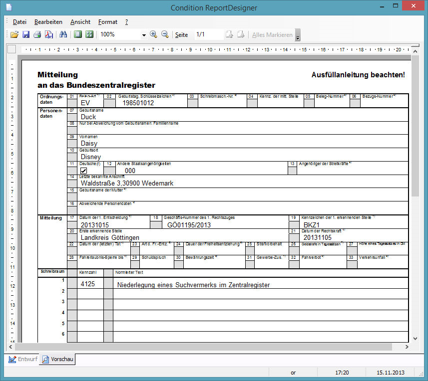 Die Registerauskunft generiert Ihnen darauf folgend ein Übersichtsblatt, welches im oberen Bereich Personendaten sowie im unteren Abschnitt die Mitteilungstextbausteine aus den elektronisch erzeugten Nachrichtendateien auflistet.