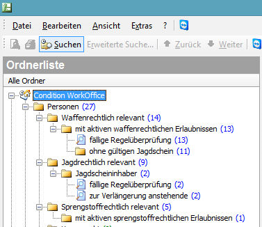 Die Personenlisten sind zentraler Verwaltungspunkt für alle Anfragen aus der Condition Registerauskunft. Das hier hinterlegte Tabellenlayout zeigt Ihnen alle in der Hauptdatenbank gespeicherten Personendatensätze, welche als "waffen-, jagd-, oder sprengstoffrechtlich relevant" markiert wurden und nicht „Verstorben“, „Verzogen“ oder „Archiviert“ sind.