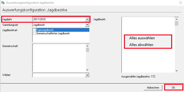 Bitte wählen Sie in der Konfigurationsmaske das gewünschte Jagdjahr aus (Auf Grundlage dieser Auswahl werden alle gültigen Jagdbezirke in diesem Jagdjahr angezeigt).