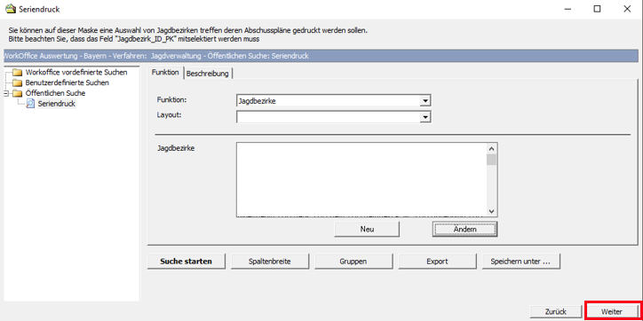 Um in die Seriendruckfunkion der Abschusspläne zu gelangen, öffnen Sie in der Jagdverwaltung das Menü Extras - Seriendruck - WorkOffice Seriendruck.