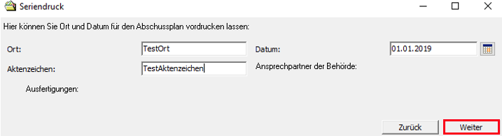In der darauf folgenden Maske füllen Sie einmalig die für den Druck notwendigen Behördenangaben zum Ort, dem Aktenzeichen und dem Druckdatum ein und bestätigen diese, indem Sie unten rechts auf die Schaltfläche [Weiter] klicken.