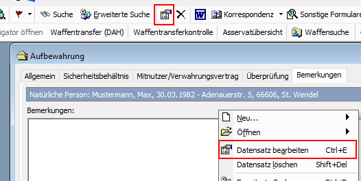 Wechseln Sie bitte zunächst auf den Reiter „Bemerkungen“ der Aufbewahrungsmaske.