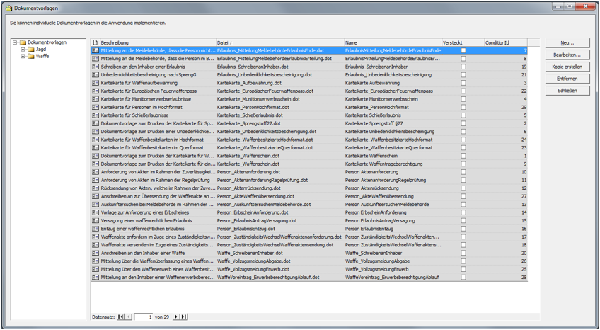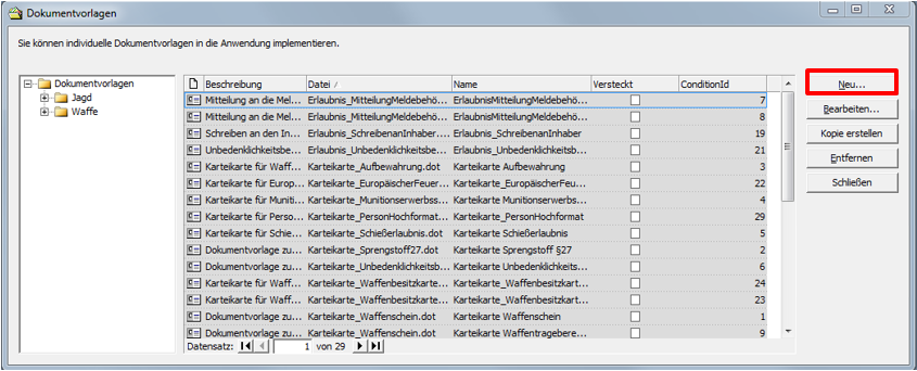 Es erscheint das Fenster „Dokumentvorlagen“, welches Ihnen ein Überblick über die bereits eingebundenen Vorlagendateien gibt.