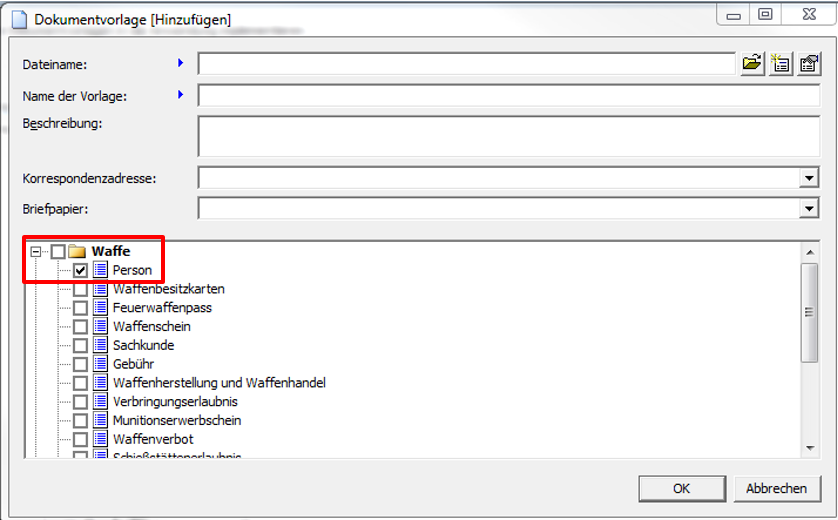 Beispiel: Angehakt wurden „Person“ und „Waffenbesitzkarte“. Das Programm kann aus der Personenmaske nur die Personendaten übergeben. WBK-Textmarken werden aufgrund der dort fehlenden Vorauswahl nicht an Word übergeben. Hingegen können aus der WBK-Maske, neben den WBK-Daten auch die verfügbaren Personendaten übergeben werden.