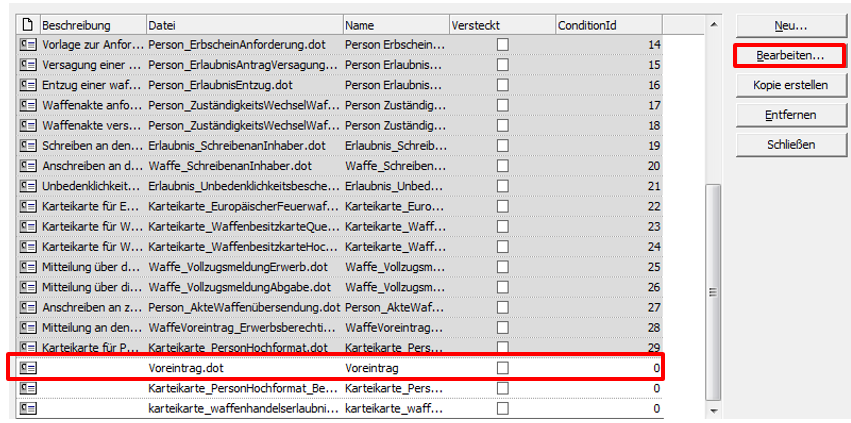 Im Folgenden sehen Sie die Maske „Dokumentvorlagen“, welche bereits mit benutzerdefinierten Vorlagen gefüllt ist. Suchen Sie in der Datentabelle das zu bearbeitende Dokument, markieren Sie dieses und klicken Sie im Anschluss auf den Button [Bearbeiten].