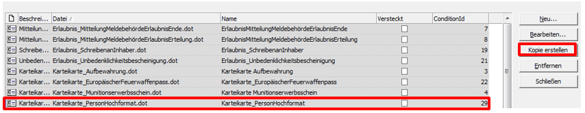 - Markieren Sie eine Vorlage aus der Übersicht der Dokumentenverwaltung. In diesem Beispiel nutzen wir die Vorlage „Karteikarte_PersonHochformat“