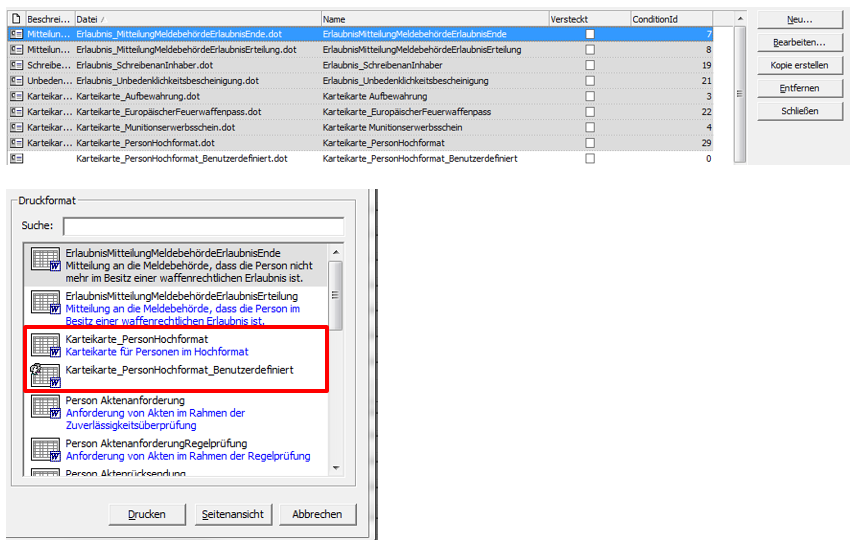 - Nach dem Abspeichern der neuen Vorlage wird diese doppelt in der Auflistung und im Druckmenü angezeigt