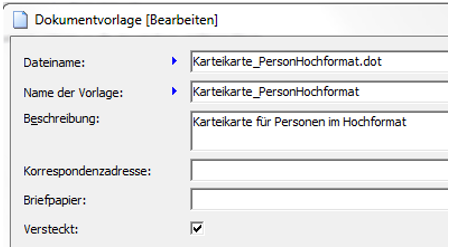 - Setzen Sie im Fenster „Dokumentenvorlage bearbeiten“ ein Häkchen bei „Versteckt“ und bestätigen Sie mit [OK]
