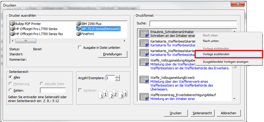 Vorlagen ein- und ausblenden im Druckmenü