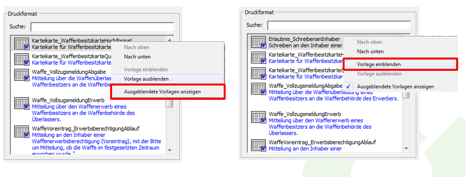 Um die Vorlage wieder einzublenden, klicken Sie erneut mit einem Rechtsklick auf eine beliebige Vorlage im Druckmenü und wählen den Punkt „ Ausgeblendete Vorlagen anzeigen“. Ist dieser Punkt aktiviert, werden wieder alle Vorlagen angezeigt.