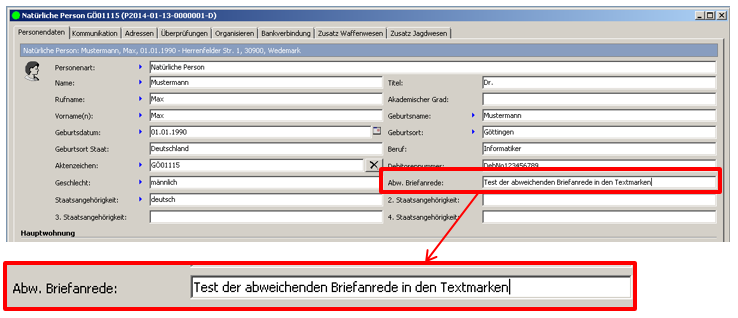 Eine weitere dynamisch von der Software befüllte Textmarke ist die Briefanrede. Diese greift primär auf das Feld „abweichende Briefanrede“ in der Personenmaske. Wird die abweichende Briefanrede nicht gefüllt, schreibt die Textmarke z. B. „Sehr geehrter Herr Max Mustermann“.