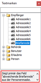 Im unteren Bereich der Maske „Textmarken“ finden Sie zu verschiedenen Textmarken eine kurze Erläuterung.