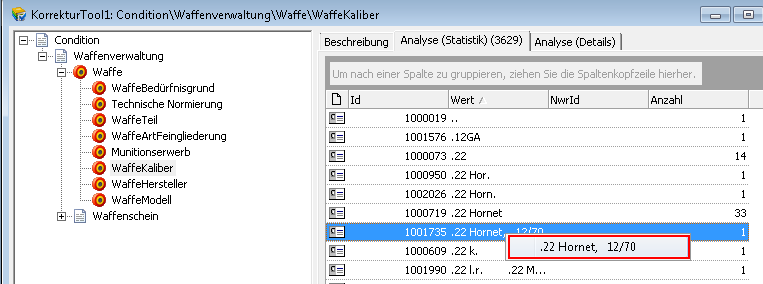 Durchführung der KorrekturWählen Sie das zu korrigierende Waffenkaliber aus der Liste aus und klicken Sie die markierte Zeile mit der rechten Maustaste an. Das gewählte Kaliber, z.B. „.22 Hornet, 12/70" wird im Kontextmenü dargestellt. Klicken Sie den Menüeintrag mit der linken Maustaste an.