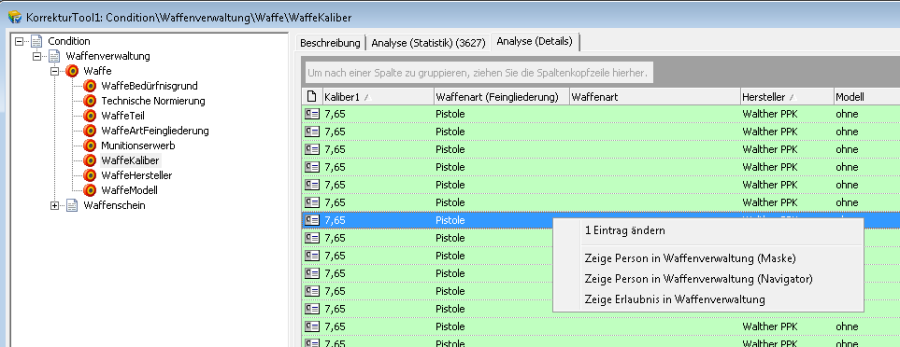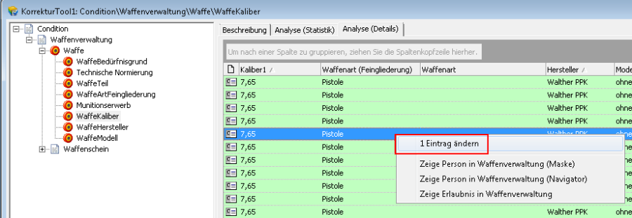 Eintrag ändern Startet den Vorgang zur Einzelbereinigung eines Waffenkalibers. Es können auch mehrere Waffen im Bereich „Analyse (Details)" von Ihnen markiert und gleichzeitig bereinig werden.
