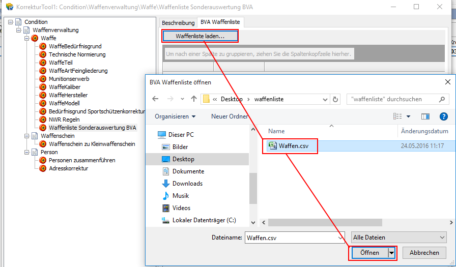 Um die Waffenliste in die Bereinigungstools zu laden, wechseln Sie auf den Reiter „BVA Waffenliste" und klicken hier auf die Schaltfläche [Waffenliste laden]. Navigieren Sie mit Hilfe des Windows Explorers in den Speicherordner auf Ihrem PC oder einem Serverlaufwerk und klicken Sie anschließend auf [Öffnen].