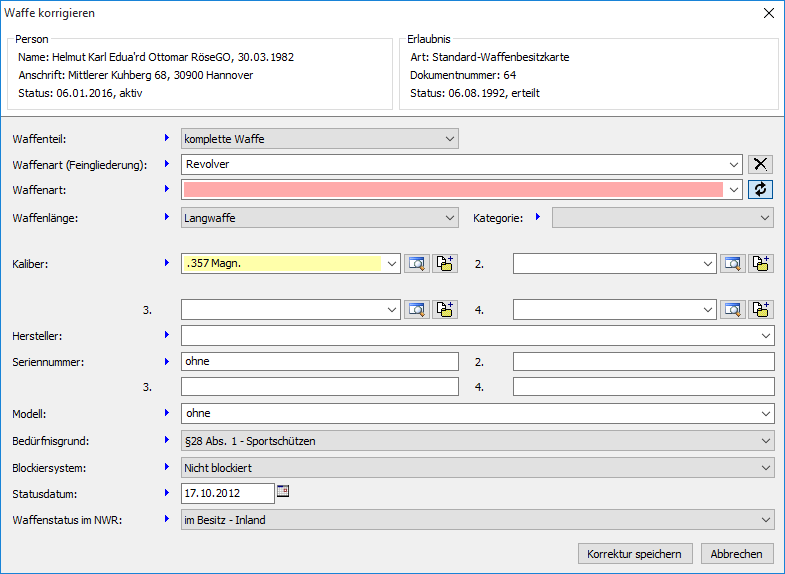 Wie aus der normalen Waffenmaske bekannt, werden Ihnen alle nicht NWR konformen Felder rot hinterlegt dargestellt und müssen vor dem Speichern bereinigt werden. Gelb hinterlegte Felder sind nicht NWR konform, werden aber beim Speichern mit dem Wert „9995 - Waffendaten teilbereinigt - bis 2017 noch vollständig zu bereinigen" an das Nationale Waffenregister übermittelt und müssen nicht zwingen angepasst werden. Im oberen Bereich der Maske finden Sie zusätzliche Informationen über den Inhaber der Waffe sowie die aktuell bei Ihnen geführte Erlaubnis auf der die Waffe eingetragen wurde.
