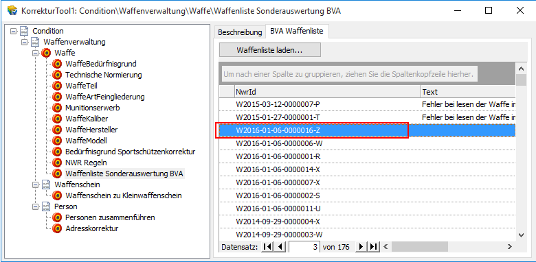 Im unteren Bereich der Maske erscheint eine Auflistung der in der Sonderauswertung enthaltenen Waffendaten. Die Extraspalte „Text" stellt evtl. beim Laden eines Waffendatensatzes auftretende Fehler dar, bspw. wenn die Zuständigkeit für einen Datensatz nicht länger besteht und eine Bereinigung im NWR nicht mehr stattfinden kann. Da Details zur Waffe erst beim Laden der eigentlichen Bearbeitungsmaske zur Verfügung stehen, sollten Sie die Liste absteigend abarbeiten. Eine Sortierung nach bestimmen Kriterien ist nicht möglich. Per Doppelklick auf eine Tabellenzeile mit der linken Maustaste gelangen Sie in die Maske „Waffe korrigieren".