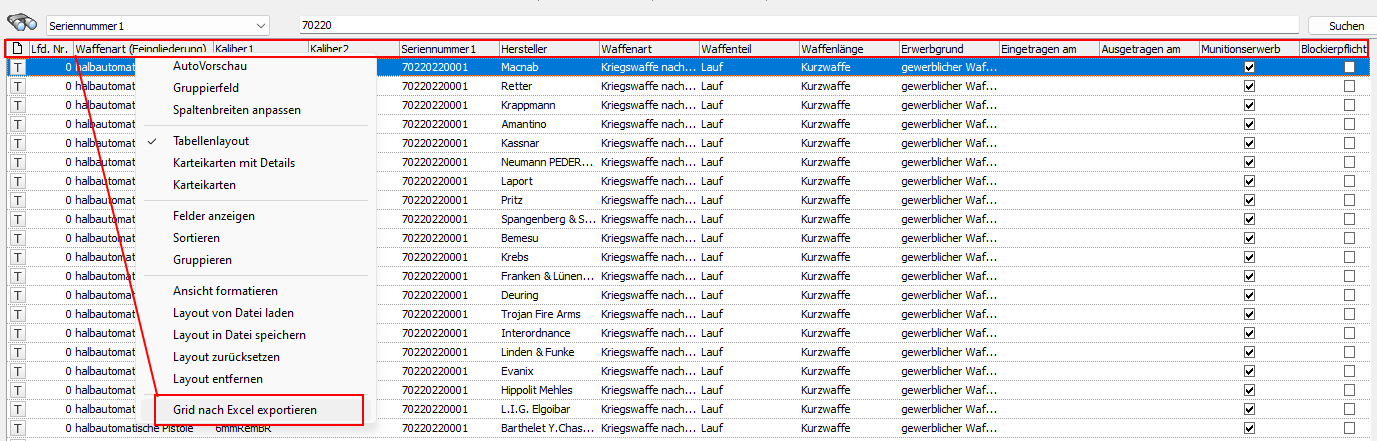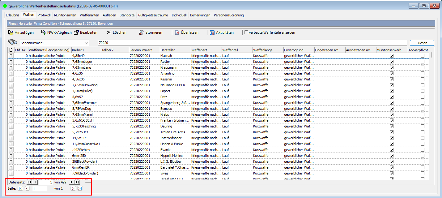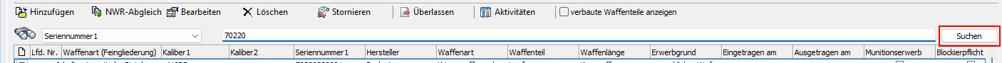 Alternativ können Sie die Suchfunktion der Waffenverwaltung verwenden, um gezielt nach einem bestimmten Waffendatensatz zu recherchieren.