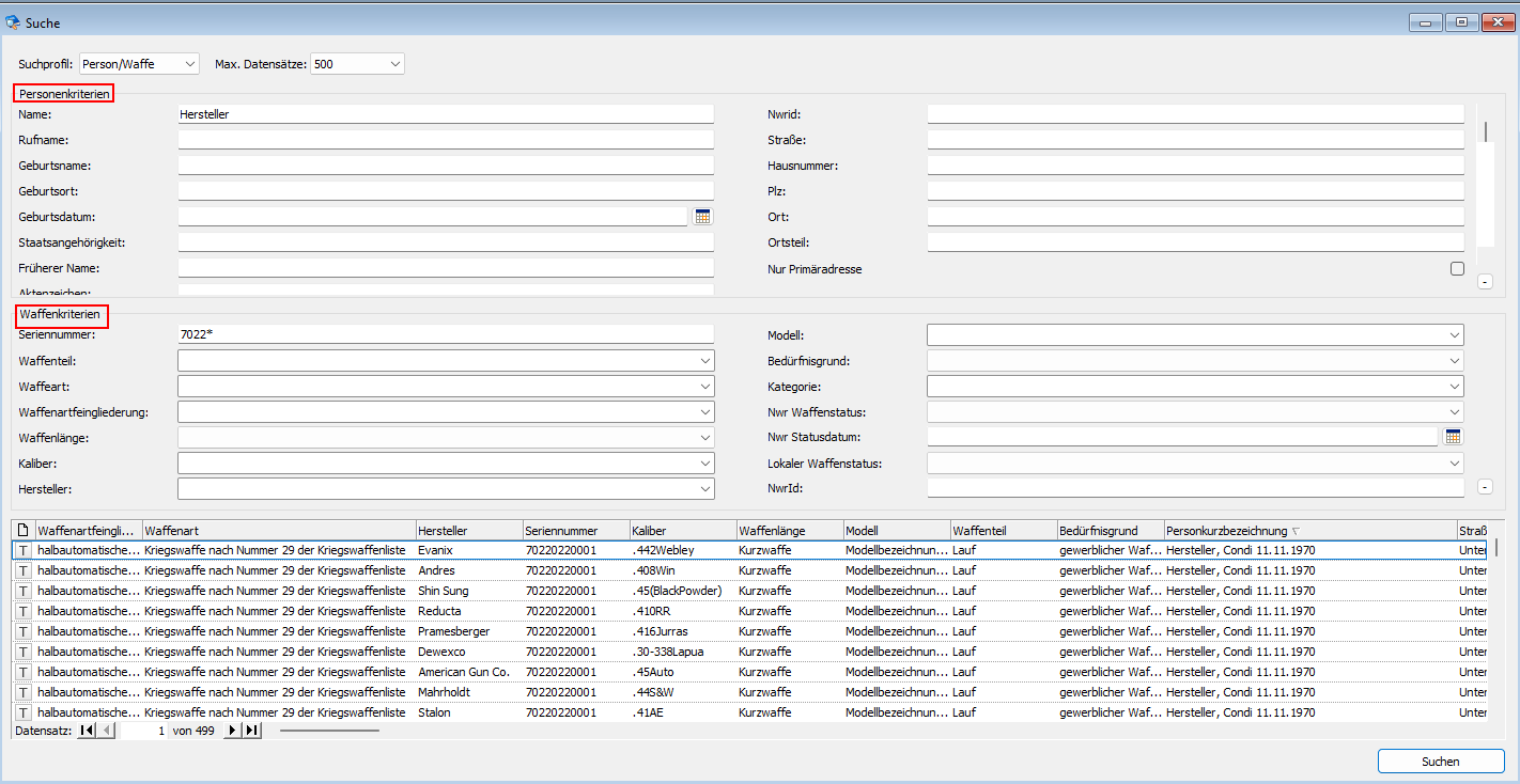 3. Tragen Sie in den Bereichen "Personenkriterien" und/oder "Waffenkriterien" entsprechende Suchkriterien ein. Im unten stehenden Beispiel werden alle Waffen der Person "Hersteller" mit der Seriennummer beginnend mit "7022" gesucht.