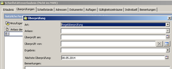 Überprüfung von Schießstätten Die Maske wurde um das Eingabefeld „Nächste Prüfung" ergänzt.