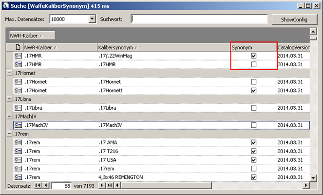 Suche nach Kalibern und KalibersynonymenDie Kaliber-Synonymsuche zeigt ab sofort grundsätzlich alle Kaliberwerte aus dem Katalog des Nationalen Waffenregisters an (ca. 2000 zusätzliche Daten). Reine Kaliberwerte, ohne ein dazugehöriges Synonym, weisen dabei im Feld „Synonym" keinen Haken auf.