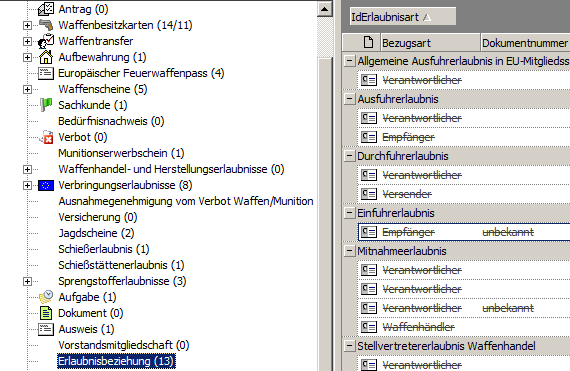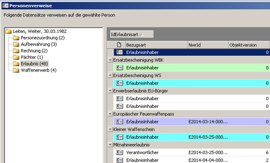 dargestellt. Personenzuordnung zu Erlaubnissen Ab sofort können die „Erlaubnisbeziehungen" einer Person über den gleichnamigen Punkt des Navigators eingesehen werden. Hierdurch wird sofort ersichtlich, ob der Personendatensatz bspw. auf eine Waffenbesitzkarte für Vereine, Waffentrageberechtigung oder Verbringungserlaubnis hinterlegt, die Person aber nicht „Inhaber" der Erlaubnis ist.