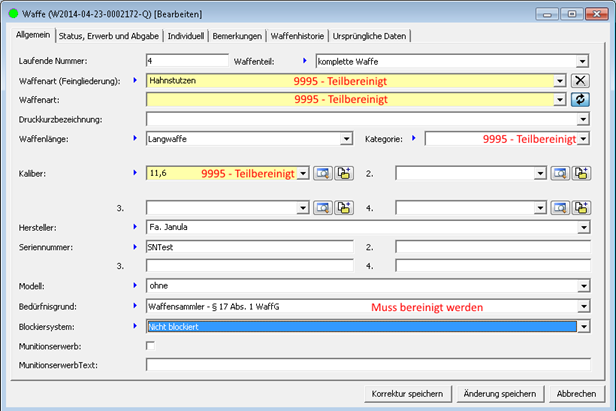 Teilbereinigte Speicherung von WaffendatenWaffen können nun auch „teilbereinigt" im NWR mit der ID 9995 – „Waffendaten teilbereinigt - bis 2017 noch vollständig zu bereinigen" abgespeichert werden. Ausgenommen davon ist der „Bedürfnisgrund", für welchen die ID 9995 nicht existiert. So können bspw. bei einer Waffe nur die Kaliberwerte editiert werden, ohne im selben Schritt auch die „Waffenart/-feingliederung" bereinigen zu müssen.