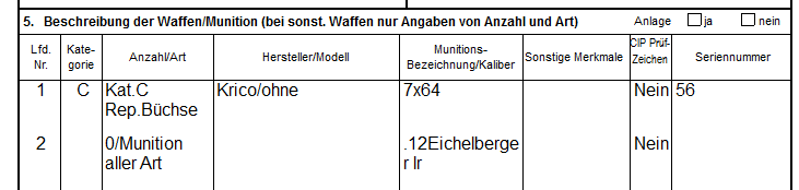 Mit Hilfe der Detailansicht können nun die Waffendaten auf einer Ein- und Ausfuhrerlaubnis in bspw. Schriftgröße 12 ausgedruckt werden.