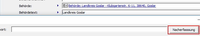 Nacherfassung von BehördenFunktion zum Nacherfassen eines Behördendatensatzes aus der Behördensuche heraus wurde entfernt. Für den Druck ist das Feld „Behördetext" zu verwenden.