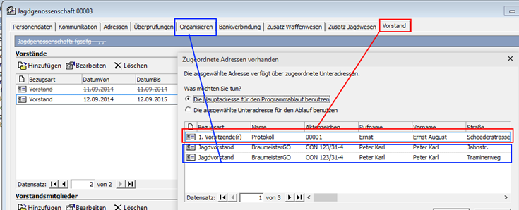 Worddruck; Verwendung von PostanschriftenAnalog zum Reiter „Organisieren", wird nun beim Personentyp „Jagdgenossenschaft" oder „Verein" der 1. Vorsitzende unter dem Reiter „Vorstand" zur Adressauswahl angeboten, wenn das Häkchen „Postanschrift" aktiviert wurde.