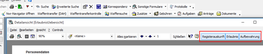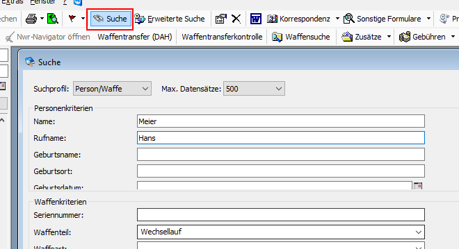 Das Hinzufügen von Waffen wurde neben den bisher bekannten Methoden „Lokale Waffen der Person" und „Waffe erfassen" um die „NWR Suche" erweitert. Eine Waffe muss nun nicht mehr zwingend auf der WBK des Erlaubnisinhabers eingetragen sein, um diese auf eine z. B. Ausfuhrerlaubnis übertragen zu können.