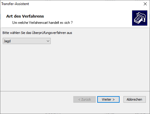 - Um eine Überprüfung auf Basis des jagdrechtlichen Antrags in OSiP durchzuführen, verwenden Sie im Warteschlangen-Assistenten bzw. im Transfer-Assistenten der Registerauskunft bitte das korrekte Verfahren "Jagd".